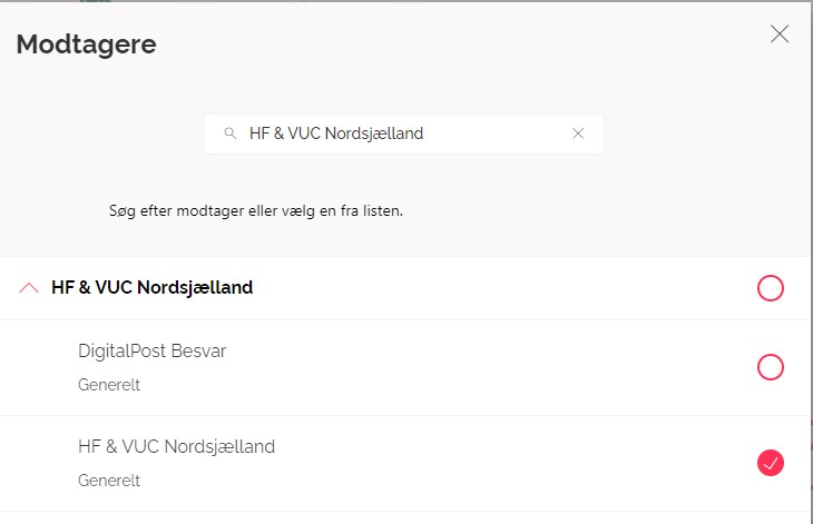 Borgere kan sende krypteret til skolen via mit.dk. Søg på HF & VUC Nordsjælland og vælg derefter HF & VUC Nordsjælland – Generelt: